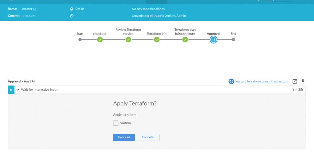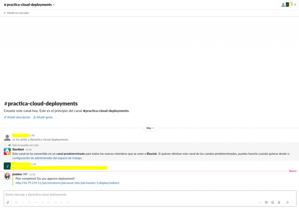 Cuando el job este ejecutando podemos observar cómo nos van a ir llegando alertas automáticamente al Slack. La primera alerta llegará en el stage de approval donde nos pedirá Jenkins que revisemos la infraestructura que vamos a desplegar y si es correcta aprobaremos el cambio: