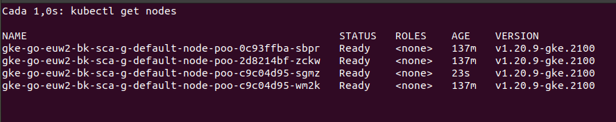 Cuando hicimos la prueba de autoescalado vimos como se había agregado un nuevo nodo llamado gke-go-euw2-bk-sca-g-default-node-poo-c9c04d95-sgmz. Este después del pico de ejecuciones de jobs en Jenkins se auto eliminará ya que no tendremos tanta actividad en nuestro GKE.