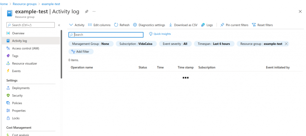 Una vez aprobado el cambio se realizará el despliegue en nuestra cuenta de Azure, donde podemos revisar que esta todo correcto y el resource group, en nuestro caso example-test, se ha desplegado correctamente: