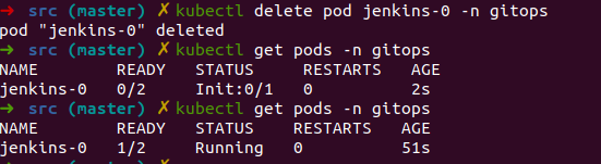 kubectl delete pod jenkins-0 -n gitops Una vez que el pod este eliminado se arrancará automáticamente: