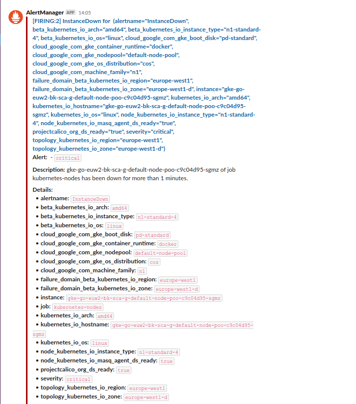 Prometheus al detectar que nuestro nodo ha desaparecido nos enviará una alerta de nodo caído automáticamente a Slack.
