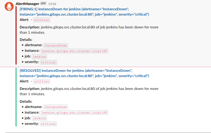 Además de alertas cuando se ejecuta un job también se hemos realizado la configuración de alertas de la infraestructura vía Prometheus. Este nos enviará alertas cuando el pod de Jenkins este caído o alguno de los nodos del cluster se caiga.