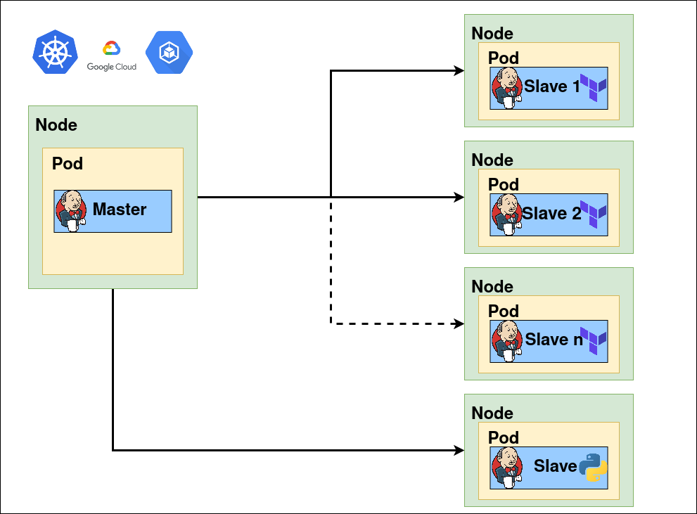 La idea de este taller es crearnos un cluster de GKE donde tengamos desplegado Jenkins como nuestra pieza central de CI/CD y que este vaya escalando en agentes de una forma totalmente automatizada para que según la demanda de ejecuciones de jobs nuestro cluster crezca o decrezca de una forma transparente para nosotros. Otra de las grandes ventajas de esta arquitectura es que podemos crear diferentes tipos de slaves para así cubrir todo tipo de ejecuciones dentro de nuestra compañía.