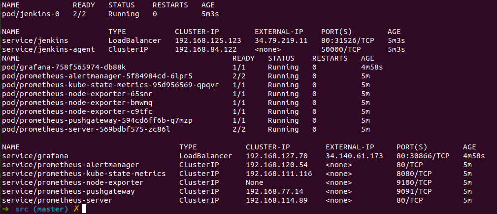 kubectl get pods,svc -n monitoring Con la siguiente salida: